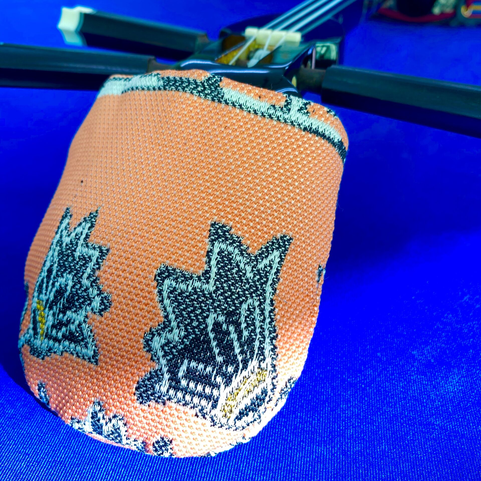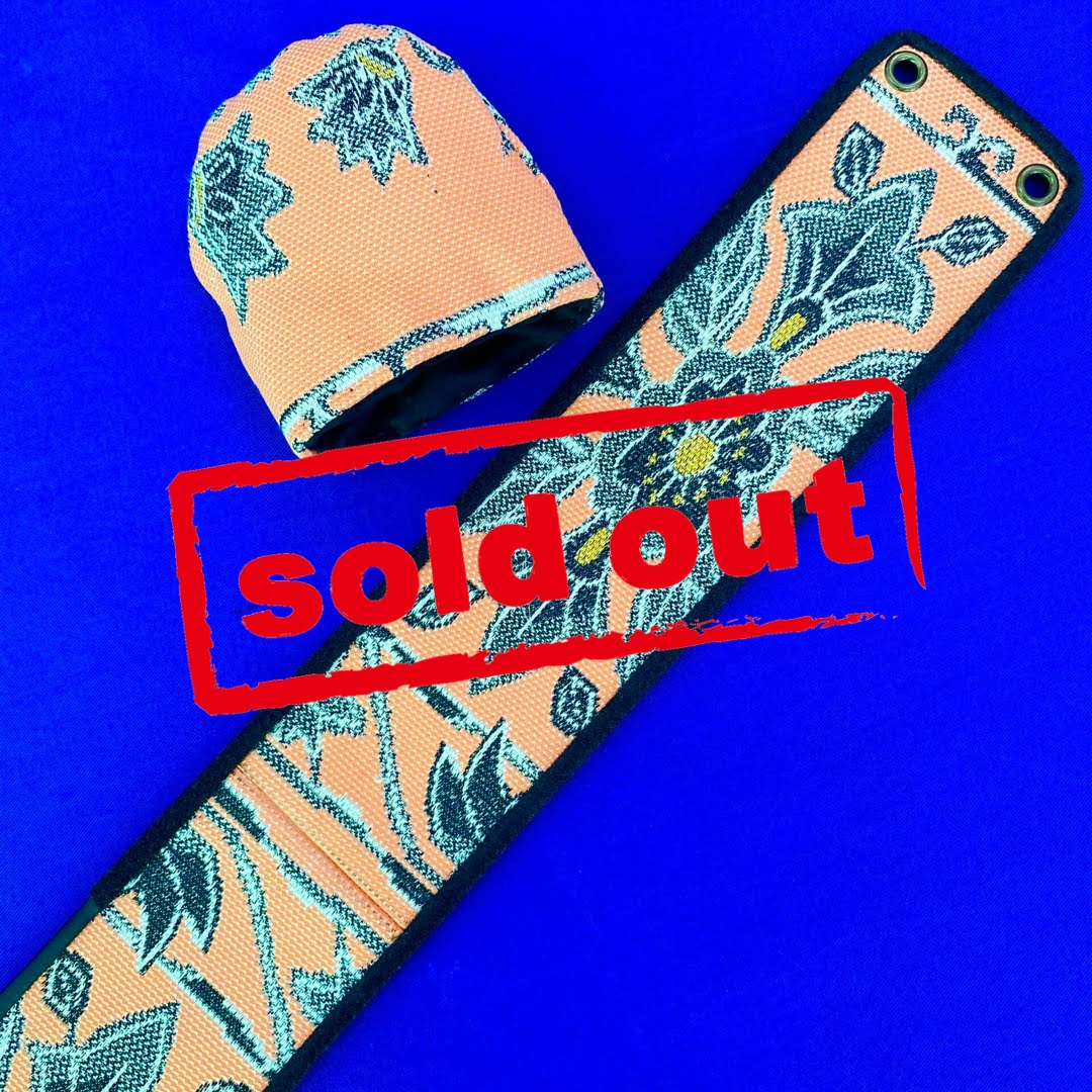素材は着物帯使用。サーモンピンクを基調に花弁は金の織り糸が使われています。南国の大地をイメージ。