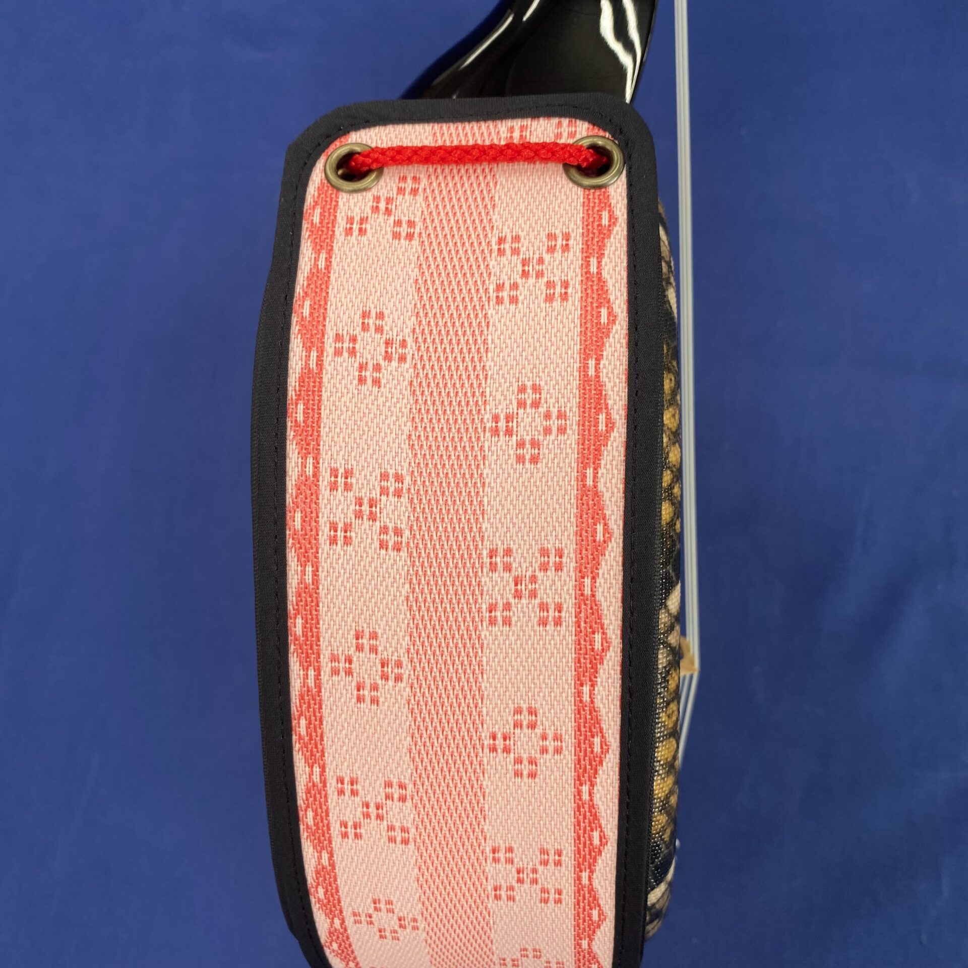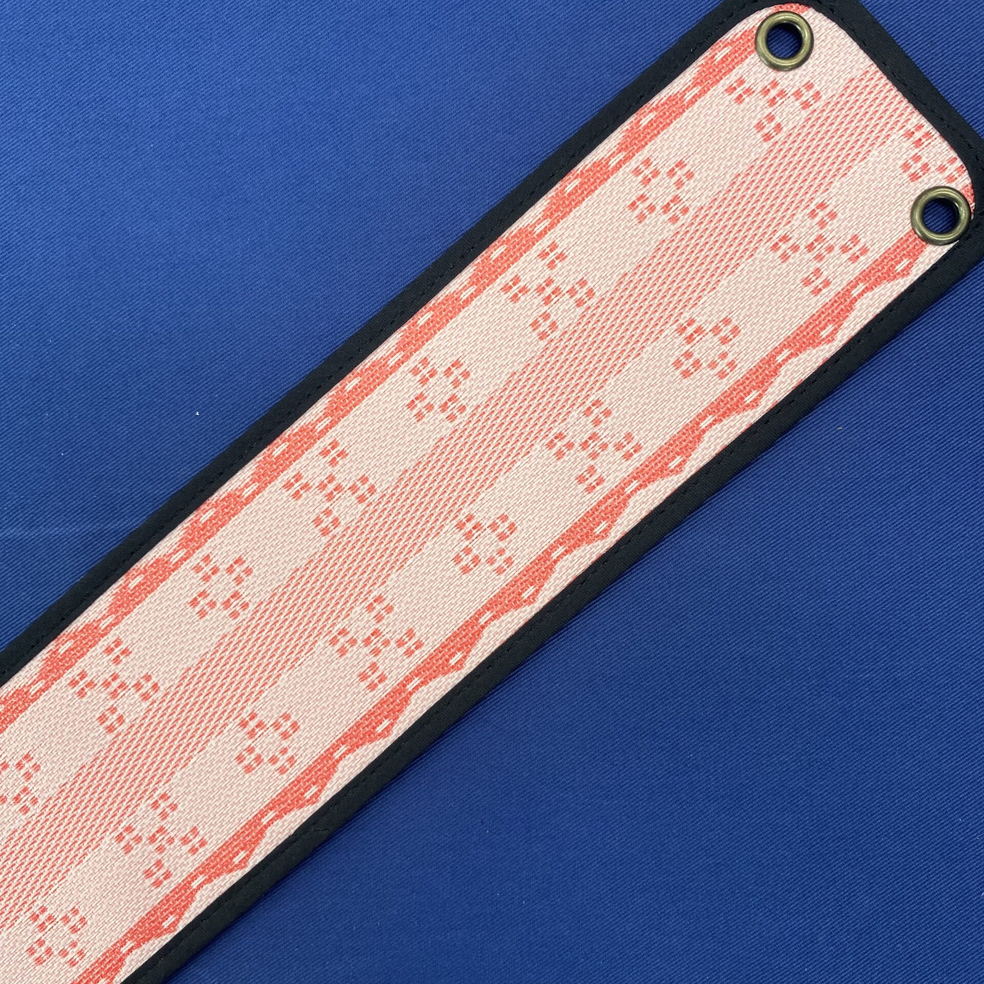 素材は畳縁を使用。沖縄らしいミンサー柄。パステルピンクを下地に濃いピンクでミンサー柄を織り込んだ作品。