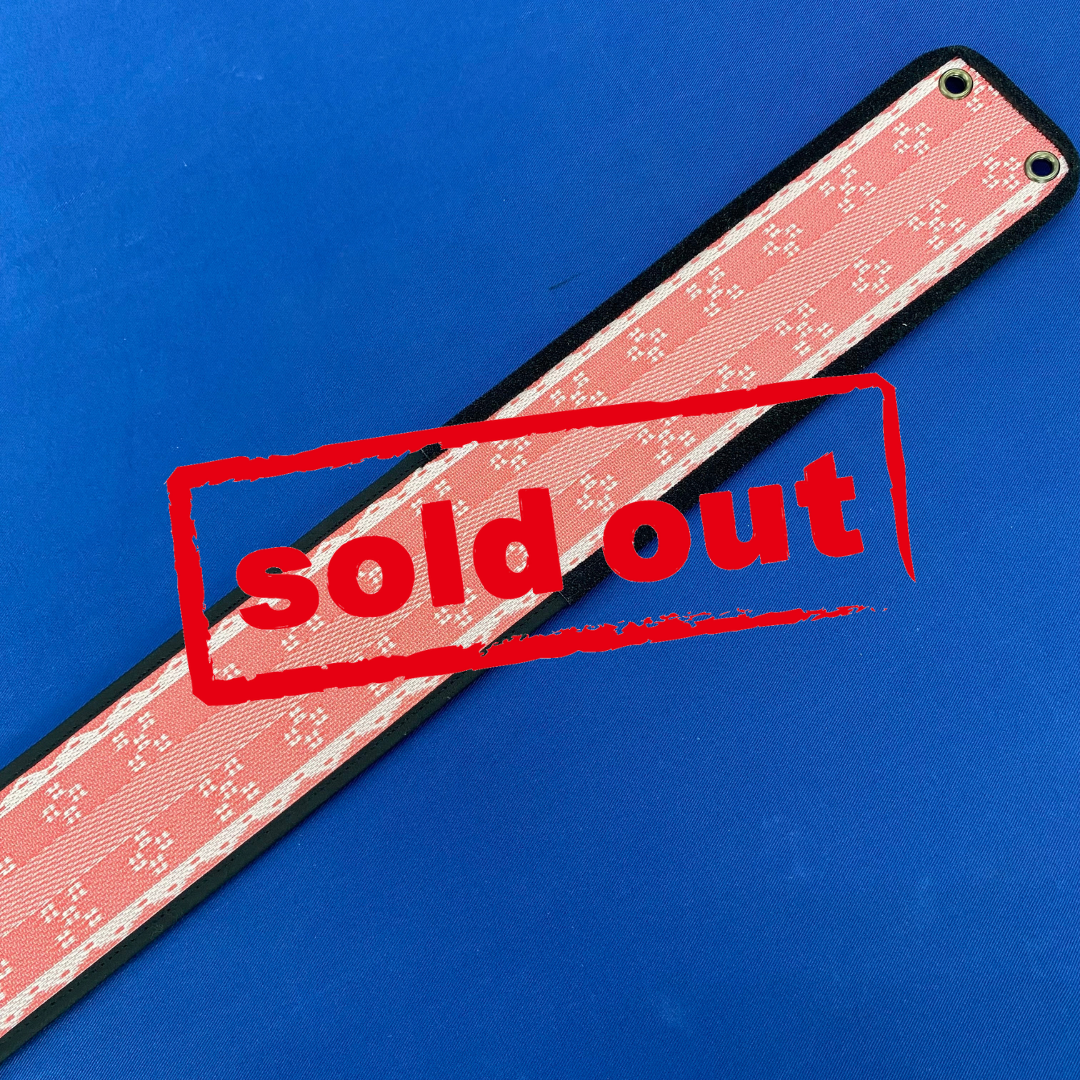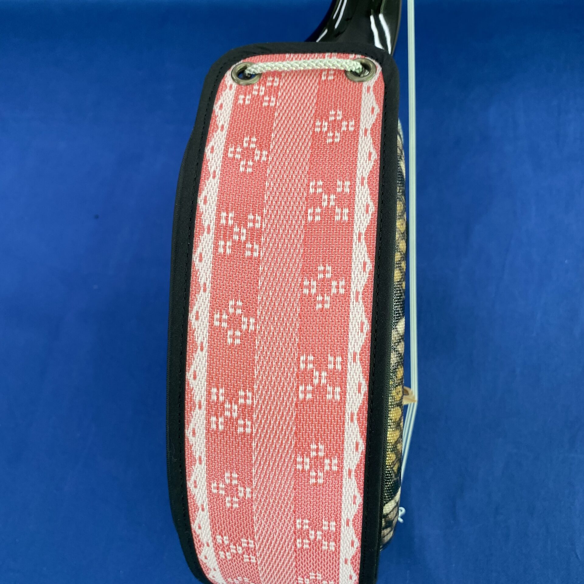 素材は畳縁を使用。沖縄らしいミンサー柄。濃いピンクが基調の可愛らしい色合いの作品。